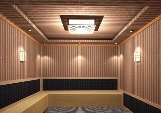(1)桑拿澡堂設分隔式小桑拿澡堂。 各室頂棚、牆麵選用防熱、防水材料裝飾。